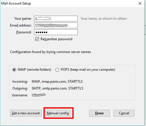 On the next window, Thunderbird will detect and display the server settings (this requires that you be online). It will do so incorrectly, so click on "Manual config".